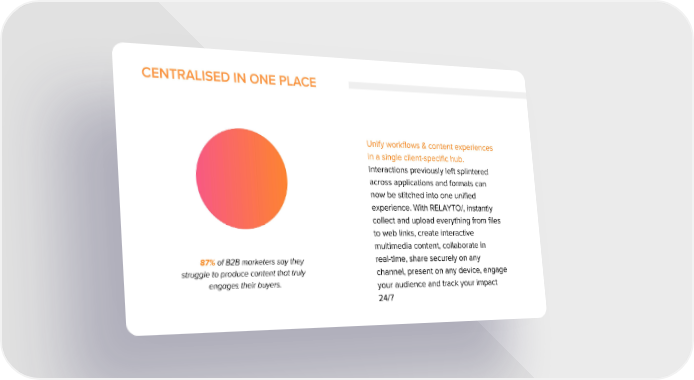 CENTRALISED IN ONE PLACE Unify workflows & content experiences in a single client-specific hub. Interactions previously left splintered across applications and formats can now be stitched into one unified experience. With RELAYTO/, instantly collect and upload everything from files to web links, create interactive multimedia content, collaborate in real-time, share securely on any 87% of B2B marketers say they struggle to produce content that truly channel, present on any device, engage engages their buyers. your audience and track your impact 24/7