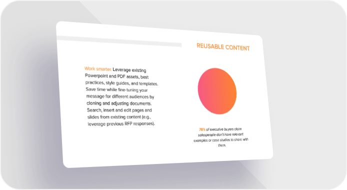 REUSABLE CONTENT Work smarter. Leverage existing Powerpoint and PDF assets, best practices, style guides, and templates. Save time while fine-tuning your message for different audiences by cloning and adjusting documents. Search, insert and edit pages and slides from existing content (e.g., leverage previous RFP responses). 78% of executive buyers claim salespeople don’t have relevant examples or case studies to share with them.