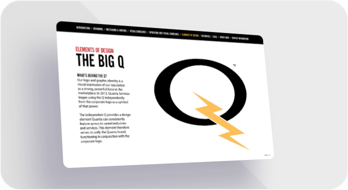 INTRODUCTION / BRANDING / MESSAGING & WRITING / VISUAL GUIDELINES / OPERATING UNIT VISUAL GUIDELINES / ELEMENTS OF DESIGN / RESOURCES / LEGAL / QUICK LINKS / CONTACT INFORMATION ELEMENTS OF DESIGN THE BIG Q TM WHAT’S BEHIND THE Q? Our logo and graphic identity is a visual expression of our reputation as a strong, powerful force in the marketplace. In 2013, Quanta Services began using the Q independently from the corporate logo as a symbol of that power. The independent Q provides a design element Quanta can consistently feature across its varied industries and services. This element therefore serves to unify the Quanta brand, functioning in conjunction with the corporate logo. PAGE 19