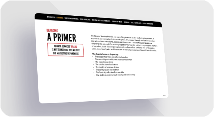 INTRODUCTION / BRANDING / MESSAGING & WRITING / VISUAL GUIDELINES / OPERATING UNIT VISUAL GUIDELINES / ELEMENTS OF DESIGN / RESOURCES / LEGAL / QUICK LINKS / CONTACT INFORMATION BRANDING The Quanta Services brand is not something invented by the marketing department. It represents our reputation in the marketplace. It is created through our collective actions A PRIMER and interactions with clients, suppliers and our team—in our offices, on job sites or wherever else we might be working together. Our brand is not just the perception we have QUANTA SERVICES’ BRAND of ourselves, but is also the perceptions others have of our company and its Operating IS NOT SOMETHING INVENTED BY Units. Every touch point and interaction in our daily work shapes Quanta’s brand identity. THE MARKETING DEPARTMENT. The Quanta brand is shaped by: • The scope of services we collectively deliver • The mentality with which we approach our work • The expertise we bring • The satisfaction of our clients • The quality of work we deliver • The safety record we maintain • The level of professionalism we offer • Our ability to communicate clearly and consistently PAGE 4