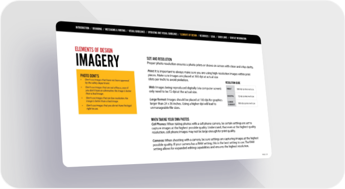 INTRODUCTION / BRANDING / MESSAGING & WRITING / VISUAL GUIDELINES / OPERATING UNIT VISUAL GUIDELINES / ELEMENTS OF DESIGN / RESOURCES / LEGAL / QUICK LINKS / CONTACT INFORMATION ELEMENTS OF DESIGN SIZE AND RESOLUTION IMAGERY Proper photo resolution ensures a photo prints or shows on screen with clean and crisp clarity. Print: It is important to always make sure you are using high-resolution images within print PHOTO DONT’S pieces. Make sure images are placed at 300 dpi at actual size • Don’t use images that have not been approved (dots per inch) to avoid pixilation. RESOLUTION GUIDE by the safety department. • Don’t use images that are out of focus, even if Web: Images being reproduced digitally (via computer screen) PRINT 300 dpi @ desired size you don’t have an alternative. No image is better only need to be 72 dpi at the actual size. than a bad image. DIGITAL 72 dpi @ desired size • Don’t use images that are low resolution. No Large format: Images should be placed at 100 dpi for graphics image is better than a bad image. larger than 24 x 36 inches. Using a higher dpi will lead to LARGE 100 dpi @ desired size • Don’t use images that you do not have the legal FORMAT right to use. unmanageable file sizes. WHEN TAKING YOUR OWN PHOTOS Cell Phones: When taking photos with a cell phone camera, be certain settings are set to capture images at the highest possible quality. Understand, that even at the highest quality resolution, cell phone images may not be large enough for print quality. Cameras: When shooting with a camera, be sure settings are capturing images at the highest possible quality. If your camera has a RAW setting, this is the best setting to use. The RAW setting allows for expanded editing capabilities and ensures the highest resolution. PAGE 24