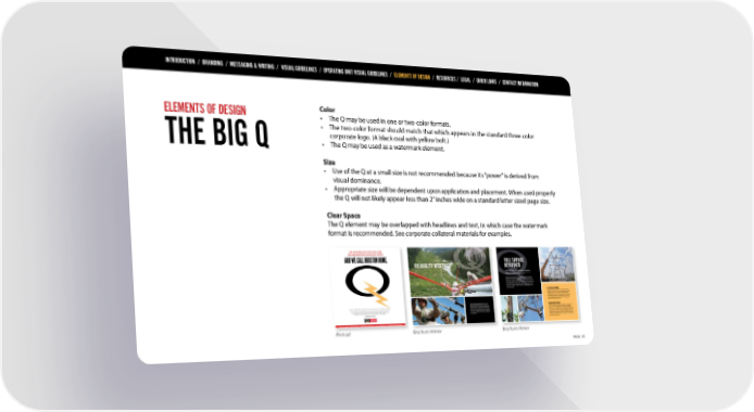 INTRODUCTION / BRANDING / MESSAGING & WRITING / VISUAL GUIDELINES / OPERATING UNIT VISUAL GUIDELINES / ELEMENTS OF DESIGN / RESOURCES / LEGAL / QUICK LINKS / CONTACT INFORMATION ELEMENTS OF DESIGN Color • The Q may be used in one or two-color formats. • The two-color format should match that which appears in the standard three-color corporate logo. (A black oval with yellow bolt.) THE BIG Q • The Q may be used as a watermark element. Size • Use of the Q at a small size is not recommended because its “power” is derived from visual dominance. • Appropriate size will be dependent upon application and placement. When used properly the Q will not likely appear less than 2” inches wide on a standard letter sized page size. Clear Space The Q element may be overlapped with headlines and text, in which case the watermark format is recommended. See corporate collateral materials for examples. Print ad Brochure interior Brochure interior PAGE 20
