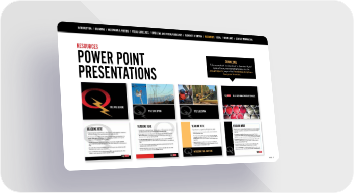INTRODUCTION / BRANDING / MESSAGING & WRITING / VISUAL GUIDELINES / OPERATING UNIT VISUAL GUIDELINES / ELEMENTS OF DESIGN / RESOURCES / LEGAL / QUICK LINKS / CONTACT INFORMATION RESOURCES DOWNLOAD POWER POINT PDFs are available for download. To download digital copies of these presentation templates, visit the MarCom Qportal page to find Presentation Templates> PRESENTATIONS Powerpoint Templates. PAGE 31