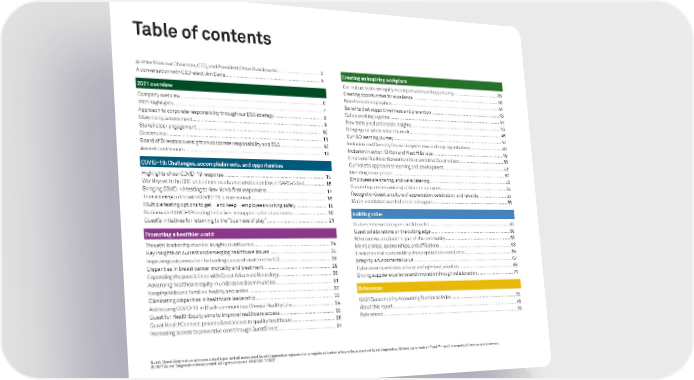 Table of contents A letter from our Chairman, CEO, and President Steve Rusckowski ..................................... 3 A conversation with CEO-elect Jim Davis ................................................................................. 4 2021 overview Company overview ...................................................................................................................... 6 2021 highlights ............................................................................................................................ 7 Approach to corporate responsibility through our ESG strategy ........................................... 8 Materiality assessment .............................................................................................................. 9 Stakeholder engagement ........................................................................................................ 10 Governance ............................................................................................................................... 11 Board of Directors oversight on corporate responsibility and ESG .................................... 12 Awards and honors .................................................................................................................. 13 COVID-19: Challenges, accomplishments, and opportunities Highlights of our COVID-19 response .................................................................................... 15 Working with the CDC and others to advance understanding of SARS-CoV-2 .................. 16 Bringing COVID-19 testing to New York’s first responders .................................................. 17 Transitioning to life with COVID-19: a new normal ............................................................... 18 Multiple testing options to get—and keep—employees working safely ........................... 19 Nationwide COVID-19 testing initiatives to support safer classrooms ............................. 20 Quest’s initiatives for returning to the “business of play” .................................................... 21 Promoting a healthier world Thought leadership marries insights to influence ............................................................... 24 Key insights on current and emerging healthcare issues ................................................... 25 Improving outcomes for the leading cause of death in the US ........................................... 28 Disparities in breast cancer mortality and treatment ......................................................... 29 Expanding the possibilities with Quest Advanced Neurology ............................................. 30 Advancing healthcare equity in underserved communities ............................................... 31 Keeping kids and families healthy and active ...................................................................... 32 Eliminating disparities in healthcare leadership ................................................................. 33 Addressing COVID-19 in Black communities: Choose Healthy Life .................................... 34 Quest for Health Equity aims to improve healthcare access .............................................. 35 Quest HealthConnect: personalized access to quality healthcare .................................... 36 Increasing access to preventive care through QuestDirect ................................................. 37 Creating an inspiring workplace Our culture rests on equity in compensation and opportunity ........................................... 39 Creating opportunities for excellence .................................................................................... 40 Workforce demographics ........................................................................................................ 41 Benefits that support wellness and prevention ................................................................... 43 Safely working together ........................................................................................................... 44 New tests yield actionable insights ....................................................................................... 45 Bringing our whole selves to work .......................................................................................... 46 Our I&D learning journey ......................................................................................................... 47 Inclusion and Diversity Council inspires new and ongoing initiatives ................................ 48 Inclusion in action: Clifton and West Hills labs ..................................................................... 49 Employee Business Networks reflect and drive Quest values ............................................ 50 Our holistic approach to learning and development ............................................................ 51 Investing in our people ............................................................................................................. 52 Employees are sharing, and we’re listening .......................................................................... 53 Supporting and recognizing all Quest employees ................................................................ 54 RecognitionQuest: a culture of appreciation, celebration, and rewards ............................ 55 Major accolades awarded to our colleagues ........................................................................ 56 Building value State-of-the-art lab opens in Clifton, NJ .............................................................................. 58 Quest collaborations on the cutting edge ............................................................................. 60 Wherever we are, Quest is part of the community ................................................................ 61 Memberships, sponsorships, and affiliations .........................