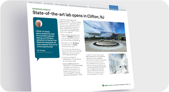 2021 CORPORATE RESPONSIBILITY REPORT I 58 In January, Quest Diagnostics began testing and, in July, completed integration of our northeast regional operations into a 250,000–square- foot next-generation lab facility in Clifton, NJ. The Clifton laboratory is now one of the largest medical laboratories globally. • Featuring extensive automation to perform 300,000+ diagnostic tests per day with exceptional accuracy, quality, and efficiency • Serving more than 40 million people per year in 7 states across the Northeast • Offering increased productivity, higher medical quality, and larger capacity to meet current and future regional demands • Conforming to Quest’s Sustainability Policy to reduce environmental impact • Seeking LEED (Leadership in Energy and Environmental Design) -equivalent certification— a prestigious rating system for healthy, highly efficient, and cost-saving green buildings— expected to be granted in 2022. EXPANDING CAPACITY State-of-the-art lab opens in Clifton, NJ In addition to faster, high-quality test processing, this unique facility represents a more than $250- million commitment to its customers and community, providing more than 1,000 jobs and serving as an economic stimulus for New Jersey. In an automated setting, these jobs offer employees skill-building opportunities and the ability to laser-focus on high-value work providing diagnostic insights. “COVID-19 clearly demonstrated the need for accurate diagnostic testing, and this lab is testament to the fact that Quest has heard that call and answered. This is truly a first-class facility.” Phil Murphy Governor, State of New Jersey TABLE OF CONTENTS 2021 OVERVIEW COVID-19 RESPONSE PROMOTING A HEALTHIER WORLD CREATING AN INSPIRING WORKPLACE BUILDING VALUE REFERENCES