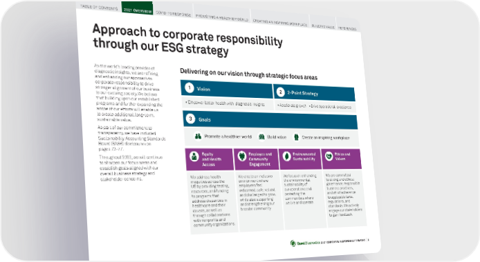 2021 CORPORATE RESPONSIBILITY REPORT I 8 Approach to corporate responsibility through our ESG strategy As the world’s leading provider of diagnostic insights, we are refining and enhancing our approach to corporate responsibility to drive stronger alignment of our business to our evolving society. We believe that building upon our established programs and further expanding the scope of our efforts will enable us to create additional, long-term, sustainable value. As part of our commitment to transparency, we have included Sustainability Accounting Standards Board (SASB) disclosures on pages 73-77. Throughout 2022, we will continue to sharpen our focus areas and establish goals aligned with our overall business strategy and stakeholder concerns. Delivering on our vision through strategic focus areas Vision 2-Point Strategy • Empower better health with diagnostic insights • Accelerate growth • Drive operational excellence 1 2 Equity and Health Access Employee and Community Engagement Environmental Sustainability Ethics and Values We address health inequities across the US by providing testing, resources, and funding to programs that address disparities in healthcare and their causes, as well as through collaborations with nonprofits and community organizations. We create an inclusive environment where employees feel welcomed, safe, valued, and challenged to grow, while also supporting and strengthening our broader community. We focus on enhancing the environmental sustainability of our operations and protecting the communities where we live and operate. We are committed to strong and ethical governance, responsible business practices, and strict adherence to applicable laws, regulations, and standards. We actively engage our stakeholders to gain feedback. Goals Promote a healthier world Build value Create an inspiring workplace 3 TABLE OF CONTENTS 2021 OVERVIEW COVID-19 RESPONSE PROMOTING A HEALTHIER WORLD CREATING AN INSPIRING WORKPLACE BUILDING VALUE REFERENCES