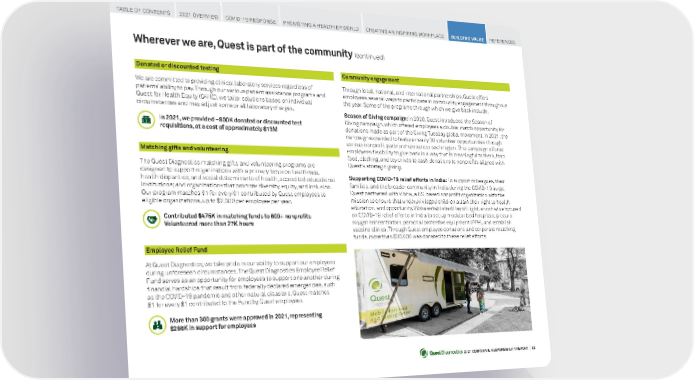 2021 CORPORATE RESPONSIBILITY REPORT I 62 Wherever we are, Quest is part of the community (continued) TABLE OF CONTENTS 2021 OVERVIEW COVID-19 RESPONSE PROMOTING A HEALTHIER WORLD CREATING AN INSPIRING WORKPLACE BUILDING VALUE REFERENCES Donated or discounted testing We are committed to providing clinical laboratory services regardless of patients’ ability to pay. Through our various patient assistance programs and Quest for Health Equity (Q4HE), we tailor solutions based on individual circumstances and may adjust some or all laboratory charges. In 2021, we provided ~800K donated or discounted test requisitions, at a cost of approximately $13M Matching gifts and volunteering The Quest Diagnostics matching gifts and volunteering programs are designed to support organizations with a primary focus on healthcare, health disparities, and social determinants of health; accredited educational institutions; and organizations that promote diversity, equity, and inclusion. Our program matches $1 for every $1 contributed by Quest employees to eligible organizations, up to $2,500 per employee per year. Contributed $475K in matching funds to 600+ nonprofits Volunteered more than 27K hours Employee Relief Fund At Quest Diagnostics, we take pride in our ability to support our employees during unforeseen circumstances. The Quest Diagnostics Employee Relief Fund serves as an opportunity for employees to support one another during financial hardships that result from federally declared emergencies, such as the COVID-19 pandemic and other natural disasters. Quest matches $1 for every $1 contributed to the Fund by Quest employees. More than 300 grants were approved in 2021, representing $268K in support for employees Community engagement Through local, national, and international partnerships, Quest offers employees several ways to participate in community engagement throughout the year. Some of the programs through which we give back include: Season of Giving campaign: In 2020, Quest introduced the Season of Giving campaign, which offered employees a double-match opportunity for donations made as part of the Giving Tuesday global movement. In 2021, the campaign expanded to feature nearly 30 volunteer opportunities through various nonprofit partnerships across each region. This campaign offered employees flexibility to give back in a way that is meaningful to them, from food, clothing, and toy drives to cash donations to nonprofits aligned with Quest's strategic giving. Supporting COVID-19 relief efforts in India: To support colleagues, their families, and the broader community in India during the COVID-19 surge, Quest partnered with Vibha, a US-based nonprofit organization with the mission to ensure that underprivileged children attain their right to health, education, and opportunity. Vibha established Ray of Light, an initiative focused on COVID-19 relief efforts in India to set up modular bed hospitals, procure oxygen concentrators, personal protective equipment (PPE), and establish vaccine clinics. Through Quest employee donations and corporate matching funds, more than $30,000 was donated to these relief efforts.