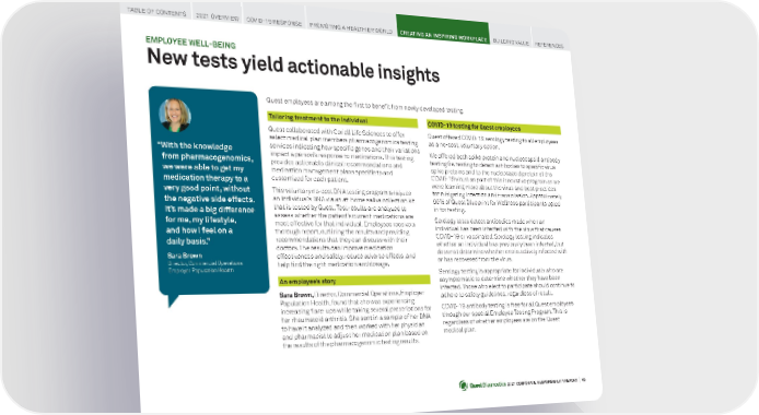 2021 CORPORATE RESPONSIBILITY REPORT I 45 EMPLOYEE WELL-BEING New tests yield actionable insights “ With the knowledge from pharmacogenomics, we were able to get my medication therapy to a very good point, without the negative side effects. It’s made a big difference for me, my lifestyle, and how I feel on a daily basis.” Sara Brown Director, Commercial Operations Employer Population Health Tailoring treatment to the individual Quest collaborated with Coriell Life Sciences to offer select medical plan members pharmacogenomics testing services indicating how specific genes and their variations impact a person’s response to medications. This testing provides actionable clinical recommendations and medication management plans specific to and customized for each patient. This voluntary no-cost DNA testing program analyzes an individual’s DNA via an at-home saliva collection kit that is tested by Quest. Test results are analyzed to assess whether the patient’s current medications are most effective for that individual. Employees receive a thorough report, outlining the results and providing recommendations that they can discuss with their doctors. The results can improve medication effectiveness and safety, reduce adverse effects, and help find the right medication and dosage. An employee ’s story Sara Brown, Director, Commercial Operations, Employer Population Health, found that she was experiencing increasing flare-ups while taking several prescriptions for her rheumatoid arthritis. She sent in a sample of her DNA to have it analyzed and then worked with her physician and pharmacist to adjust her medication plan based on the results of the pharmacogenomic testing results. TABLE OF CONTENTS 2021 OVERVIEW COVID-19 RESPONSE PROMOTING A HEALTHIER WORLD CREATING AN INSPIRING WORKPLACE BUILDING VALUE REFERENCES Quest employees are among the first to benefit from newly developed testing. COVID-19 testing for Quest employees Quest offered COVID-19 serology testing to all employees as a no-cost, voluntary option. We offered both spike protein and nucleocapsid antibody testing (ie, testing to detect antibodies to specific virus spike proteins and to the nucleocapsid protein of the COVID-19 virus) as part of this innovative program as we were learning more about the virus and best practices for mitigating infection and transmission. Approximately 80% of Quest Blueprint for Wellness participants opted in for testing. Serology tests detect antibodies made when an individual has been infected with the virus that causes COVID-19 or vaccinated. Serology testing indicates whether an individual has previously been infected, but does not determine whether one is actively infected with or has recovered from the virus. Serology testing is appropriate for individuals who are asymptomatic to determine whether they have been infected. Those who elect to participate should continue to adhere to safety guidelines, regardless of result. COVID-19 antibody testing is free for all Quest employees through our special Employee Testing Program. This is regardless of whether employees are on the Quest medical plan.