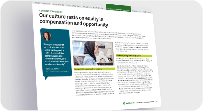 2021 CORPORATE RESPONSIBILITY REPORT I 39 Our equitable compensation program Our compensation programs are designed to attract, retain, and motivate a wide variety of employees and to help drive the execution of our business objectives and strategic goals. Our competitive base pay reflects several factors, including individual roles and responsibilities, skills, experience, and performance. We also have designed our compensation programs to align with market compensation (in the relevant geography, as appropriate) based on robust market benchmarking. Beyond salary, Quest’s compensation package includes variable pay, other forms of financial recognition, and a comprehensive benefits offering, including 401K, paid time off, workplace flexibility, remote work options, and healthcare coverage. We also compensate nonexempt employees with overtime pay and pay shift differentials when appropriate. Identifying, hiring, and managing talent Our ability to evolve, expand, and develop world-class innovations relies on a culture that respects all employees and supports their contributions. Quest’s Talent Acquisition team proactively sources talented candidates with unique skills, backgrounds, experiences, and expertise from multiple ethnicities, ages, and cultures to fill open positions. We work to identify and recruit people whose strong skill sets and perspectives represent our company. When Quest hires or promotes from within, we consider each candidate’s qualifications and experience, as well as market-based information, as we strive to be externally competitive and internally equitable. Quest uses narrow role-based salary ranges for new hires and continuing employees alike. Our Human Resources function oversees our annual talent review process so that performance reviews are fair, well-documented, and unbiased. A STRONG FOUNDATION Our culture rests on equity in compensation and opportunity “ Being an employer of of choice is about the entire package—the right fit, competitive compensation and relevant benefits, and a culture that values and celebrates diversity.” Noreen M. Farrell Vice President, Rewards and Analytics As an organization, we are committed to fostering an inclusive workplace that welcomes new perspectives, complementary experiences, and diverse expertise. We know that these attributes strengthen our ability to surpass our customers’ and our communities’ expectations. That commitment includes providing all our employees with equitable compensation and development opportunities. TABLE OF CONTENTS 2021 OVERVIEW COVID-19 RESPONSE PROMOTING A HEALTHIER WORLD CREATING AN INSPIRING WORKPLACE BUILDING VALUE REFERENCES