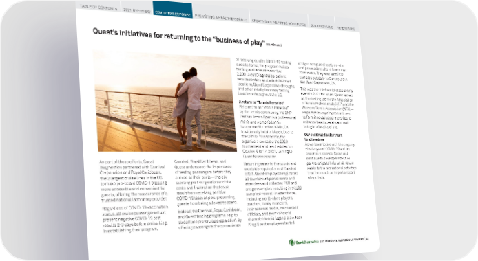 2021 CORPORATE RESPONSIBILITY REPORT I 22 As part of these efforts, Quest Diagnostics partnered with Carnival Corporation and Royal Caribbean, the 2 largest cruise lines in the US, to make pre-board COVID-19 testing more accessible and convenient for guests, offering the reassurance of a trusted national laboratory provider. Regardless of COVID-19 vaccination status, all cruise passengers must present negative COVID-19 test results 2-3 days before embarking. In establishing their program, Carnival, Royal Caribbean, and Quest understood the importance of testing passengers before they arrived at their ports—thereby avoiding port congestion and the costs and frustration that could result from receiving positive COVID-19 tests at port, preventing guests from being allowed to board. Instead, the Carnival, Royal Caribbean, and Quest testing programs help to streamline pre-cruise preparation. By offering passengers the convenience of receiving quality COVID-19 testing close to home, the program makes testing available at more than 2,200 Quest Diagnostics patient service centers and select Walmart locations, Giant Eagle drive-throughs, and other retail pharmacy testing locations throughout the US. A return to “Tennis Paradise” Referred to as “Tennis Paradise” by the tennis community, the BNP Paribas Tennis Open is a professional men’s and women’s tennis tournament in Indian Wells, CA traditionally held in March. Due to the COVID-19 pandemic, the organizers canceled the 2020 tournament and rescheduled for October 6 to 17, 2021, turning to Quest for assistance. Returning safely to the courts and courtside required a multifaceted effort. Quest employees registered all tournament participants and attendees and collected PCR and antigen samples (resulting in >4,500 samples) from all in attendance, including world-class players, coaches, family members, international media, tournament officials, and even VIP world champion tennis legend Billie Jean King. Quest employees tested Quest’s initiatives for returning to the “business of play” (continued) antigen samples directly on-site and provided results in fewer than 20 minutes. They also sent PCR samples out daily to Quest’s lab in San Juan Capistrano, CA. This was the third world-class tennis event in 2021 for which Quest served as the testing lab for the Association of Tennis Professionals (ATP) and the Women’s Tennis Association (WTA) — as part of its ongoing commitment to form innovative partnerships to enhance health, safety, and well- being in all walks of life. Our continued safe return to all we love As we learn to live with the ongoing challenges of COVID-19 and its endemic presence, Quest will continue to develop innovative partnerships to help us all return safely to the recreational activities that form such an important part of our lives. TABLE OF CONTENTS 2021 OVERVIEW COVID-19 RESPONSE PROMOTING A HEALTHIER WORLD CREATING AN INSPIRING WORKPLACE BUILDING VALUE REFERENCES