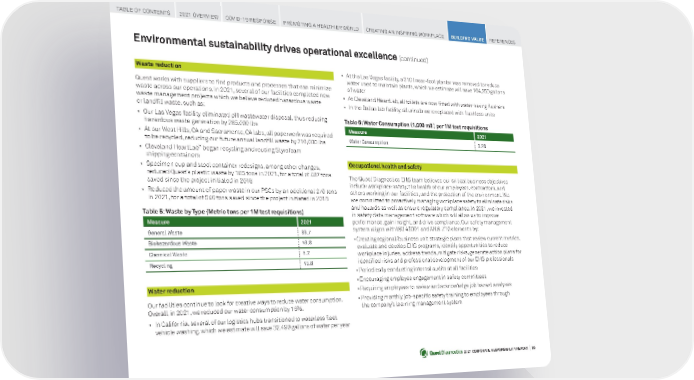 2021 CORPORATE RESPONSIBILITY REPORT I 66 • At the Las Vegas facility, a 310 linear-foot planter was removed to reduce water used to maintain plants, which we estimate will save 164,250 gallons of water • At Cleveland HeartLab, all toilets are now fitted with water-saving flushers • In the Dallas lab facility, all urinals were replaced with flushless units Occupational health and safety The Quest Diagnostics EHS team believes our critical business objectives include workplace safety; the health of our em ployees, contractors, and others working in our facilities; and the protection of the environment. We are committed to proactively managing workplace safety to eliminate risks and hazards as well as ensure regulatory compliance. In 2021, we invested in safety data management software which will allow us to improve performance, gain insight, and drive compliance. Our safety management system aligns with ISO 45001 and ANSI Z10 elements by: • Creating regional/business unit strategic plans that review current metrics, evaluate and develop EHS programs, identify opportunities to reduce workplace injuries, address trends, mitigate risks, generate action plans for identified risks and professional development of our EHS professionals • Periodically conducting internal audits at all facilities • Encouraging employee engagement in safety committees • Requiring employees to review and acknowledge job hazard analyses • Providing monthly job-specific safety training to employees through the company’s learning management system Waste reduction Quest works with suppliers to find products and processes that can minimize waste across our operations. In 2021, several of our facilities completed new waste management projects which we believe reduced hazardous waste or landfill waste, such as: • Our Las Vegas facility eliminated pH wastewater disposal, thus reducing hazardous waste generation by 285,000 lbs • At our West Hills, CA and Sacramento, CA labs, all paperwork was required to be recycled, reducing our future annual landfill waste by 210,000 lbs • Cleveland HeartLab ™ began recycling and reusing Styrofoam shipping containers • Specimen cup and stool container redesigns, among other changes, reduced Quest’s plastic waste by 105 tons in 2021, for a total of 407 tons saved since the project initiated in 2018 • Reduced the amount of paper waste in our PSCs by an additional 270 tons in 2021, for a total of 546 tons saved since the project initiated in 2018 Environmental s ustainability drives operational excellence (continued) Table 5: Waste by Type (Metric tons per 1M test requisitions) Measure 2021 General Waste 89.7 Biohazardous Waste 49.8 Chemical Waste 5.2 Recycling 45.8 Water reduction Our facilities continue to look for creative ways to reduce water consumption. Overall, in 2021, we reduced our water consumption by 16%. • In California, several of our logistics hubs transitioned to waterless fleet vehicle washing, which we estimate will save 32,490 gallons of water per year Table 6: Water Consumption (1,000 m3 ) per 1M test requisitions Measure 2021 Water Consumption 3.28 TABLE OF CONTENTS 2021 OVERVIEW COVID-19 RESPONSE PROMOTING A HEALTHIER WORLD CREATING AN INSPIRING WORKPLACE BUILDING VALUE REFERENCES