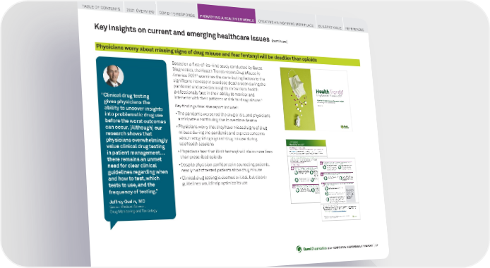 2021 CORPORATE RESPONSIBILITY REPORT I 27 Trends ® 1 1. . The COVID - 19 pandemic worsened the drug crisis and physicians anticipate a continuing rise in overdose deaths 2 2 . . Physicians worry they have missed signs of drug misuse and use disorders during the pandemic and express concerns about telehealth Based on a first-of-its-kind study conducted by Quest Diagnostics, the Health Trends report Drug Misuse in America 2021 1 examines the contributing factors to the significant increase in overdose deaths seen during the pandemic and provides insights on barriers health professionals face in their ability to monitor and intervene with their patients at risk for drug misuse. 1 Key findings from the report include 1 : • The pandemic worsened the drug crisis, and physicians anticipate a continuing rise in overdose deaths • Physicians worry that they have missed signs of drug misuse during the pandemic and express concerns about recognizing signs of drug misuse during telehealth sessions • Physicians fear that illicit fentanyl will claim more lives than prescribed opioids • Despite physician confidence in counseling patients, nearly half of tested patients show drug misuse • Clinical drug testing is deemed critical, but clearer guidelines would help optimize its use “Clinical drug testing gives physicians the ability to uncover insights into problematic drug use before the worst outcomes can occur. [Although] our research shows that physicians overwhelmingly value clinical drug testing in patient management... there remains an unmet need for clear clinical guidelines regarding when and how to test, which tests to use, and the frequency of testing.” Jeffrey Gudin, MD Senior Medical Advisor, Drug Monitoring and Toxicology 1 Health Trends ® Drug Misuse in America 2021 Physician Perspectives and Diagnostic Insights on the Drug Crisis and COVID-19 November 2021 3 3 . . Physicians are prescribing more gabapentin than opioids for chronic pain and worry patients will turn to illicit fentanyl 4 4 . . Despite physician confidence in counseling patients, nearly half of tested patients show drug misuse 5 5. . Clinical drug testing is deemed critical, but clearer guidelines would help optimize its us e Quest, Quest Diagnostics, any associated logos , and all associated Quest Diagnostics registered or unregistered trademarks are the property of Quest Diagnostics. All third-par ty marks— ® and ™— are the property of their respective owners. © 2021 Quest Diagnostics Incorporated. A ll rights reserved. MI10758 11/2021 Key insights on current and emerging healthcare issues (continued) Physicians worry about missing signs of drug misuse and fear fentanyl will be deadlier than opioids TABLE OF CONTENTS 2021 OVERVIEW COVID-19 RESPONSE PROMOTING A HEALTHIER WORLD CREATING AN INSPIRING WORKPLACE BUILDING VALUE REFERENCES