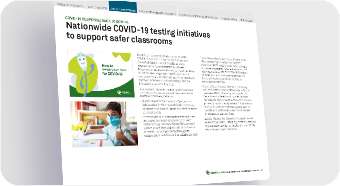 2021 CORPORATE RESPONSIBILITY REPORT I 20 COVID-19 RESPONSE: BACK TO SCHOOL Nationwide COVID-19 testing initiatives to support safer classrooms It’s difficult to overestimate the toll that the COVID-19 pandemic has had on many of our nation’s children—academically, socially, developmentally, and emotionally. Quest Diagnostics recognizes the critical role that daily in-school learning plays in helping our kids to overcome the very real challenges they faced with repeated lockdowns, school closings, and the limitations of remote learning. In our commitment to supporting communities throughout the country, Quest has established multiple initiatives, including: • Quest’s “Back to the Classroom” program to help develop K–12 in-school COVID-19 testing solutions that allow students and staff to return to school safely • Partnerships to further expand testing access and capacity, including collaboration with biotechnology company Ginkgo Bioworks and agreements with multiple state departments of health, including Arizona (through its collaboration with Sonora Quest Laboratories), Texas, Pennsylvania, and more. The programs offer weekly, high-quality, “pod-pooled” molecular (PCR) swab tests to rapidly sample students and staff to reduce the likelihood of asymptomatic spread of COVID-19. Members of pods who test positive are provided with home self-collection kits for testing to determine next steps. • Quest’s Great Midwest Region is partnering with the Battelle Memorial Institute in Ohio to facilitate COVID-19 testing through the US Department of Health and Human Services for millions of Americans in midwestern states, primarily in public and private K-12 schools as well as for underserved populations, such as people who are homeless and those who live in congregate care settings. Quest’s “Back to the Classroom” program as well as additional COVID-19 testing initiatives, are also helping college students, faculty, and staff safely return to and stay on campus. TABLE OF CONTENTS 2021 OVERVIEW COVID-19 RESPONSE PROMOTING A HEALTHIER WORLD CREATING AN INSPIRING WORKPLACE BUILDING VALUE REFERENCES