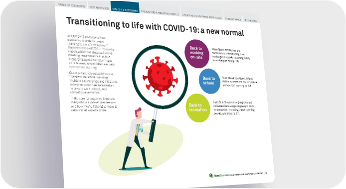 2021 CORPORATE RESPONSIBILITY REPORT I 18 Transitioning to life with COVID-19: a new normal Back to recreation Back to school Back to working on-site Many Quest employees are successfully transitioning from working remotely to returning safely to working on-site (p. 19). Read about how Quest helped children across the country return to in-school learning (p. 20). Quest’s innovative new programs and collaborations are getting people back to recreation, including travel, sporting events, and more (p. 21). TABLE OF CONTENTS 2021 OVERVIEW COVID-19 RESPONSE PROMOTING A HEALTHIER WORLD CREATING AN INSPIRING WORKPLACE BUILDING VALUE REFERENCES As COVID-19 transitions from pandemic to endemic, we’re learning to live a “new normal.” Reported levels of COVID-19 vary by region, with most states adjusting masking requirements in public areas. Employees are returning to on-site work, and children are back to in-school learning. Quest proactively established our “ Back to Life ” effort including multiple partnerships and initiatives to help communities safely return to on-site work, school, and recreational activities. In the coming pages, we'll discuss many of our successful endeavors and how they're helping so many to return to all aspects of life.