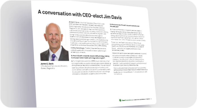 2021 CORPORATE RESPONSIBILITY REPORT I 4 A conversation with CEO-elect Jim Davis James E. Davi s is the Chief Executive Officer (CEO)-elect and Executive Vice President, General Diagnostics, for Quest Diagnostics. As Executive Vice President, General Diagnostics, Jim managed all diagnostic testing services and the company’s operations, including sales and marketing, patient and customer services, laboratories, logistics, and billing. He has also provided enterprise oversight for Quest’s COVID-19 response, including rapid expansion of testing capacity and testing innovation. Jim’s leadership has strengthened Quest’s partnerships with the nation’s largest health plans and health systems, integrated our regional lab acquisitions, and driven the evolution of our ESG strategy. Lindsey Greenberger, Director, Corporate Responsibility and ESG, spoke with Jim about the role of ESG efforts in achieving our mission. Q. How is Quest’s corporate responsibility strategy helping to empower better health with diagnostic insights? A . Our heightened awareness of ESG issues reminds us that our responsibility as a public company goes beyond delivering strong financial results to our shareholders. How we conduct business and contribute to our society, environment, and communities is critical to our long-term, sustainable growth. In our quest to promote a healthier world, we must strongly embrace our employees, suppliers, and communities. Q. What are some of Quest’s key achievements over the past year? A . I’m proud of the role our diagnostic services played in helping individuals and businesses stay safe during the pandemic and begin to return to life. Our efforts to maintain strong supplier partnerships have been effective; we did not experience significant supply chain interruptions. And we returned our non–COVID-19 business to pre-pandemic levels. To open our new flagship laboratory in Clifton, NJ, we successfully overcame multiple pandemic-related hurdles. Quest’s new 250,000–square-foot facility is truly state of the art—and one of the largest automated clinical laboratories globally. We’ve continued to make meaningful investments in building a diverse and inclusive culture at Quest with multiple initiatives to recognize, appreciate, and celebrate our employees. Our data show firsthand that the pandemic has heightened healthcare disparities, and through our Quest for Health Equity (Q4HE) programs, we’ve committed to addressing and reducing these inequities. There is still a lot of work to be done, but I’m proud of what we’ve accomplished as a team thanks to Steve’s tremendous leadership over the past decade. I’m excited about our path for the future. James E. Davis CEO-elect and Executive Vice President, General Diagnostics