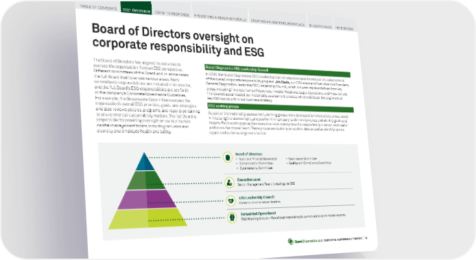 2021 CORPORATE RESPONSIBILITY REPORT I 12 Board of Directors oversight on corporate responsibility and ESG Quest Diagnostics ESG Leadership Council In 2020, the Quest Diagnostics ESG Leadership Council was developed to oversee the advancement of the overall corporate responsibility program. Jim Davis, our CEO-elect and Executive Vice President, General Diagnostics, leads the ESG Leadership Council, which includes representatives from key areas, including Finance, Human Resources, Investor Relations, Legal, Operations, and Procurement. The Council spearheaded our materiality assessment process, which will foster the alignment of key ESG topics within our business strategy. ESG working groups As part of the materiality assessment, working groups were developed to review select areas, assist in finalizing the assessment, and position the company to define objectives and identify goals and targets. Each working group has executive-level oversight and is supported by a senior-level leader and cross-functional team. These groups are building on work to date as well as identifying new opportunities for us to go even further. The Board of Directors has aligned its activities to oversee the organization from an ESG perspective. Different committees of the Board and, in some cases the full Board itself, oversee various areas. Each committee’s responsibilities are included in its charter, and the full Board’s ESG responsibilities are set forth in the company’s Corporate Governance Guidelines. For example, the Governance Committee oversees the organization’s overall ESG priorities, goals, and strategies and also reviews policies, programs, and reports pertaining to environmental sustainability matters. The full Board is responsible for providing oversight on various human capital management topics, including inclusion and diversity and employee health and safety. Board of Directors • Audit and Finance Committee • Governance Committee • Compensation Committee • Quality and Compliance Committee • Cybersecurity Committee Executive Level Senior Management Team, including the CEO ESG Leadership Council Cross-functional senior leaders Embedded/Operational ESG Working Groups – Functional material topic owners and subject matter experts TABLE OF CONTENTS 2021 OVERVIEW COVID-19 RESPONSE PROMOTING A HEALTHIER WORLD CREATING AN INSPIRING WORKPLACE BUILDING VALUE REFERENCES