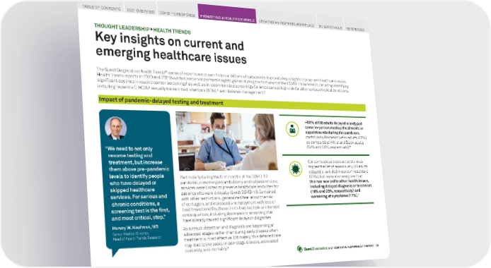 2021 CORPORATE RESPONSIBILITY REPORT I 25 ~60% of US adults delayed or skipped some in-person medical treatments or appointments during the pandemic, particularly Hispanic/Latinx adults (67%) as compared to White and Black adults (59% and 58%, respectively). 6 Concerns about exposure to the virus topped the list of reasons why US adults delayed or avoided in-person healthcare (53%), but many also recognize that this has now led to other health issues, including delayed diagnosis or treatment (18% and 23%, respectively) and worsening of symptoms (17%). 6 THOUGHT LEADERSHIP } HEALTH TRENDS Key insights on current and emerging healthcare issues Particularly during the first months of the COVID-19 pandemic, nonemergent ambulatory and outpatient clinic services were limited to preserve healthcare resources for patients who were critically ill with COVID-19. Combined with other restrictions, generalized fear about the risk of contagion, and increased unemployment with loss of healthcare benefits, these limits had multiple unintended consequences, including decreases in screening that have already caused significant delays in diagnoses. As a result, detection and diagnosis are happening at advanced stages rather than during early disease when treatment is most effective. Ultimately, this deferred care may lead to increases in late-stage disease, associated morbidity, and mortality. 5 “ We need to not only resume testing and treatment, but increase them above pre-pandemic levels to identify people who have delayed or skipped healthcare services. For serious and chronic conditions, a screening test is the first, and most critical, step.” Harvey W. Kaufman, MD Senior Medical Director, Head of Health Trends Research The Quest Diagnostics Health Trends ® series of reports are drawn from our billions of data points to provide key insights into current healthcare issues. Health Trends reports in 2020 and 2021have focused on important insights gained during the first years of the COVID-19 pandemic, including identifying significant declines in routine cancer screenings 1 as well as in recommended screenings for Americans at high risk for other serious medical conditions, including hepatitis C (HCV), 2 sexually transmitted infections (STIs), 3 and diabetes management. 4 Impact of pandemic-delayed testing and treatment TABLE OF CONTENTS 2021 OVERVIEW COVID-19 RESPONSE PROMOTING A HEALTHIER WORLD CREATING AN INSPIRING WORKPLACE BUILDING VALUE REFERENCES