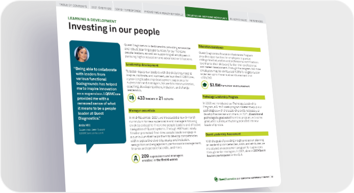 2021 CORPORATE RESPONSIBILITY REPORT I 52 Quest Diagnostics is dedicated to providing accessible and robust learning opportunities for our frontline people leaders, as well as supporting all employees in pursuing higher education and advanced certifications. Leadership development To better equip our leaders with the skills they need to inspire, motivate, and succeed, we launched LQSMCore, a year-long leadership development experience for supervisors and managers, focused on communication, coaching, developing others, inclusion, and change leadership. 433 leaders in 21 cohorts Manager essentials In mid-November 2021, we introduced a new 6-month curriculum for new supervisors and managers focusing on skills critical for first-time people leaders and effective navigation of Quest systems. Through EMPower, newly hired or promoted first-time people leaders engage in a curriculum that helps them to develop competencies within topics like diversity, equity and inclusion, recognition and engagement, performance management, finance and operational skills, and more. 209 supervisors and managers enrolled in the first 6 weeks LEARNING & DEVELOPMENT Investing in our people “ Being able to collaborate with leaders from various functional backgrounds has helped me to inspire innovation as a supervisor. LQSMCore provided me with a renewed sense of what it means to be a people leader at Quest Diagnostics. ” Asia Hill Supervisor, Lean Supply LQSMCore participant Education assistance Quest Diagnostics Education Assistance Program provides opportunities for employees to pursue college-level education and professional certifications to enhance their skills and further their professional and career development. Through the program, full-time employees may be reimbursed 100% for eligible tuition expenses up to the annual reimbursement limit of $5,250. $3.5 M for tuition reimbursement Pathology Leadership Program In 2020, we introduced our Pathology Leadership Program, a 6- to 8-week program created to equip our pathologists with the leadership skills necessary to develop themselves and others. In 2021, 25 additional pathologists graduated from this program, with some graduates subsequently being promoted into new leadership roles. Quest Leadership Assessment With the goal of providing insight and action planning on leadership competencies, skills, and attributes, we introduced an assessment program for supervisors through senior managers. In 2021, almost 2200 Quest leaders participated in the QLA. TABLE OF CONTENTS 2021 OVERVIEW COVID-19 RESPONSE PROMOTING A HEALTHIER WORLD CREATING AN INSPIRING WORKPLACE BUILDING VALUE REFERENCES