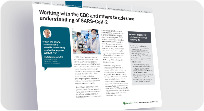 2021 CORPORATE RESPONSIBILITY REPORT I 16 Working with the CDC and others to advance understanding of SARS-CoV-2 In 2021, Quest labs continued to work with the Centers for Disease Control and Prevention (CDC) on genomic sequencing of SARS-CoV-2, the virus that causes COVID-19. The goal of the collaboration is to aid the CDC in conducting a large-scale survey of the SARS-CoV-2 virus to identify novel mutations, providing insights on the patterns of transmission and prevalence of these mutations in the US. Quest’s large-scale longitudinal genomic survey of the virus uses a random set of samples collected from Quest labs across the US. Quest sequences the virus genome “ Public and private collaboration is essential to mobilizing an effective response to COVID-19. ” Jay G. Wohlgemuth, MD Chief Medical Officer, Senior Vice President, Research & Development in random, deidentified samples that test positive during molecular diagnostic COVID-19 testing for clinicians, providing the CDC with whole viral sequences. These data are combined with the results of other data provided to the CDC by national, state, academic, and commercial labs, helping to meet the CDC survey’s aims. Quest’s program complements the CDC’s efforts to identify, characterize, and track new viral variants, enhancing the country’s public health response. Quest has a long history of collaboration with the CDC to improve public health initiatives, including identifying screening, diagnostic, and treatment trends in HIV, viral hepatitis, and sexually transmitted infections in the US, based on insights obtained by analysis of Quest’s national testing database. Quest is also a member of the SARS-CoV-2 Sequencing for Public Health Emergency Response, Epidemiology, and Surveillance (SPHERES) consortium. TABLE OF CONTENTS 2021 OVERVIEW COVID-19 RESPONSE PROMOTING A HEALTHIER WORLD CREATING AN INSPIRING WORKPLACE BUILDING VALUE REFERENCES New and ongoing 2 021 collaborative studies on COVID-19 In addition to our collaboration with the CDC, we are participating in additional studies to support public health and to enhance our understanding of how the virus impacts various populations across the health and economic spectrum. Some of Quest’s 2021 and ongoing projects include: • T-cell immune response to mRNA vaccines (Yale School of Medicine) • Host genetics and COVID-19 severity (Memorial Sloan Kettering Cancer Research Center) • Minority and rural COVID-19 insights study (co-funded by Quest) • Emerging infections surveillance (Boston Children's Hospital)