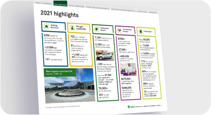 2021 CORPORATE RESPONSIBILITY REPORT I 7 2021 highlights 63M COVID-19 molecular and antibody tests performed since the pandemic began ~218M test requisitions processed (an increase of >30M from last year) 1 2 1 new tests added 102 peer-reviewed publications by authors from Quest and affiliates 8 1 abstracts and national meeting presentations ~1 , 100 issued and 450 pending patents owned or controlled by Quest worldwide $15M+ in corporate giving and Quest for Health Equity grants 2 7 ,000+ employee volunteer hours ~800,000 donated or discounted test requisitions $475,000 in matching funds to 600+ nonprofits $ 268,000 extended to over 300 employees via the Employee Relief Fund Nearly 50,000 colleagues globally * Over 13,000 new employees welcomed to the Quest team Over 5,000 employees promoted and advancing their careers at Quest 71% of employees globally identify as female and 29% identify as male 56% of US employees identify as people of color, representing more diversity than in the US workforce as a whole 650+ MDs and PhDs on medical and scientific staff 10 Employee Business Networks (EBNs) with 7,000+ memberships 7 , 100+ patient access points across the US 2 , 100+ of our own patient service centers ~ 230 retail testing services locations at select Walmart and Safeway locations nationwide More than 21 .5M users registered for MyQuest ® —an increase of nearly 7 million, or ~50%, in 1 year 75,000+ courier stops daily 20+ aircraft serving the US Testing Services Consumer Reach Community Impact Employees Thought Leadership New flagship automated lab opened in Clifton, NJ *Less than 1% of our employees are represented by a union. TABLE OF CONTENTS 2021 OVERVIEW COVID-19 RESPONSE PROMOTING A HEALTHIER WORLD CREATING AN INSPIRING WORKPLACE BUILDING VALUE REFERENCES