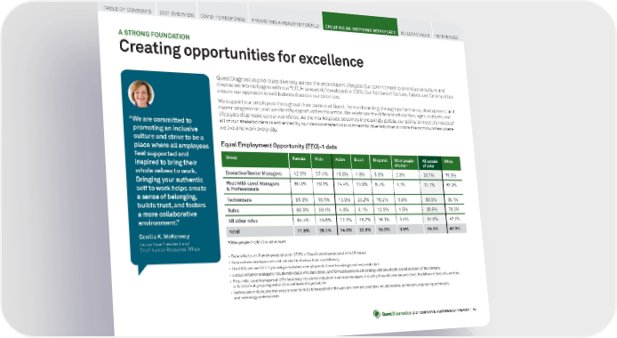 2021 CORPORATE RESPONSIBILITY REPORT I 40 Quest Diagnostics prioritizes diversity across the entire talent lifecycle. Our commitment to an inclusive culture and diverse workforce begins with our “CTC Framework,” developed in 2020. Our 3 pillars of Culture, Talent, and Communities ensure our approach is well balanced across our priorities. We support our employees throughout their careers at Quest, from onboarding, through performance, development, and career progression, and we identify opportunities for action. We celebrate the different ethnicities, ages, cultures, and lifestyles that make up our workforce. As the marketplace becomes increasingly global, our ability to meet the needs of all of our stakeholders is enhanced by our demonstrated commitment to diversity that mirrors the communities where we live and work every day. A STRONG FOUNDATION Creating opportunities for excellence Group Female Male Asian Black Hispanic Other people of color * All people of color White Executive/Senior Managers 42.6% 57.4% 13.0% 4.6% 3.8% 2.3% 23.7% 76.3% First/Mid-Level Managers & Professionals 60.9% 39.1% 14.4% 10.9% 8.7% 3.1% 37.1% 62.9% Technicians 81.9% 18.1% 15.9% 25.2% 19.2% 3.6% 63.9% 36.1% Sales 60.9% 39.1% 4.3% 8.1% 12.9% 1.5% 26.8% 73.2% All other roles 64.4% 35.6% 12.1% 26.2% 16.1% 3.4% 57.8% 42.2% Total 71.8% 28.2% 14.0% 22.8% 16.2% 3.5% 56.5% 43.5% Equal Employment Opportunity (EEO)-1 data *Other people of color/2 or more races • Data reflect our US employee population; 97.5% of Quest’s employee population is US-based • Data exclude employees who did not elect to disclose their race/ethnicity • The EEOC defines EEO-1 job categories based on employee skill level, knowledge, and responsibilities • Executive/Senior Managers include individuals who plan, direct, and formulate policies, set strategy, and provide the overall direction of the company • First-/Mid-Level Managers and Professionals include individuals who serve as managers, including those who oversee and direct the delivery of products, services, or functions at group, regional, or divisional levels of organizations • Technicians include jobs that require specific skills to be applied in the work environment; examples include medical technicians, engineering technicians, and technology professionals TABLE OF CONTENTS 2021 OVERVIEW COVID-19 RESPONSE PROMOTING A HEALTHIER WORLD CREATING AN INSPIRING WORKPLACE BUILDING VALUE REFERENCES “ We are committed to promoting an inclusive culture and strive to be a place where all employees feel supported and inspired to bring their whole selves to work. Bringing your authentic self to work helps create a sense of belonging, builds trust, and fosters a more collaborative environment.” Cecilia K. McKenney Senior Vice President and Chief Human Resources Officer