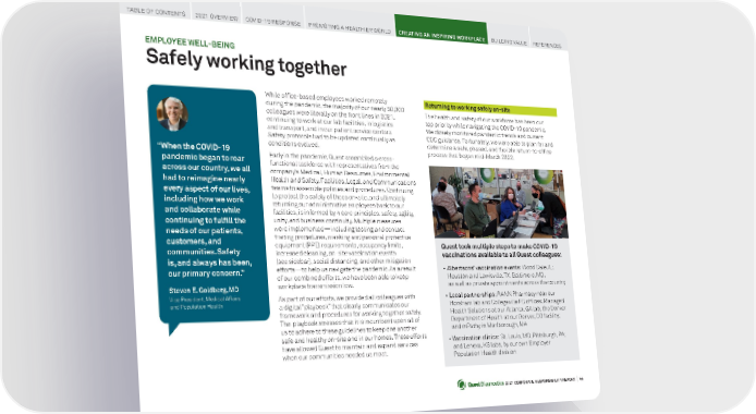 2021 CORPORATE RESPONSIBILITY REPORT I 44 EMPLOYEE WELL-BEING Safely working together While office-based employees worked remotely during the pandemic, the majority of our nearly 50,000 colleagues were literally on the front lines in 2021, continuing to work at our lab facilities, in logistics and transport, and in our patient service centers. Safety protocols had to be updated continually as conditions evolved. Early in the pandemic, Quest assembled a cross- functional taskforce with representatives from the company’s Medical, Human Resources, Environmental Health and Safety, Facilities, Legal, and Communications teams to assemble policies and procedures. Continuing to protect the safety of those on-site, and ultimately returning our administrative employees back to our facilities, is informed by 4 core principles: safety, agility, unity, and business continuity. Multiple measures were implemented—including testing and contact tracing procedures, masking and personal protective equipment (PPE) requirements, occupancy limits, increased cleaning, on-site vaccination events (see sidebar), social distancing, and other mitigation efforts—to help us navigate the pandemic. As a result of our combined efforts, we have been able to keep workplace transmission low. As part of our efforts, we provided all colleagues with a digital “playbook” that clearly communicates our framework and procedures for working together safely. The playbook stresses that it is incumbent upon all of us to adhere to these guidelines to keep one another safe and healthy on-site and in our homes. These efforts have allowed Quest to maintain and expand services when our communities needed us most. Returning to working safely on-site The health and safety of our workforce has been our top priority while navigating the COVID-19 pandemic. We closely monitored pandemic trends and current CDC guidance. Fortunately, we were able to plan for and determine a safe, phased, and flexible return-to-office process that began mid-March 2022. “ When the COVID-19 pandemic began to roar across our country, we all had to reimagine nearly every aspect of our lives, including how we work and collaborate while continuing to fulfill the needs of our patients, customers, and communities. Safety is, and always has been, our primary concern.” Steven E. Goldberg, MD Vice President, Medical Affairs and Population Health Quest took multiple steps to make COVID-19 vaccinations available to all Quest colleagues: • Albertsons’ vaccination events: Wood Dale, IL; Houston and Lewisville, TX; Baltimore, MD; as well as private appointments across the country • Local partnerships: RANN Pharmacy near our Horsham lab and Collegeville PD offices; Managed Health Solutions at our Atlanta, GA lab; the Denver Department of Health at our Denver, CO facility; and mPathy in Marlborough, MA • Vaccination clinics: St. Louis, MO; Pittsburgh, PA; and Lenexa, KS labs, by our own Employer Population Health division TABLE OF CONTENTS 2021 OVERVIEW COVID-19 RESPONSE PROMOTING A HEALTHIER WORLD CREATING AN INSPIRING WORKPLACE BUILDING VALUE REFERENCES