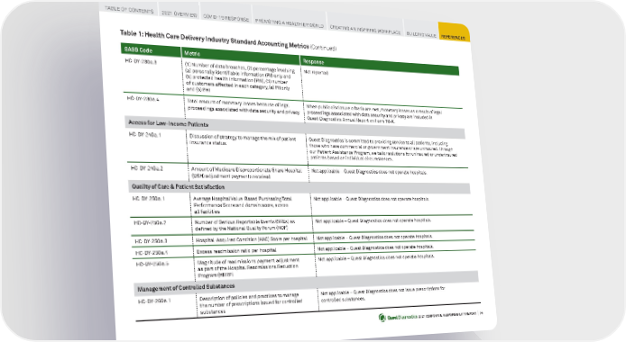 2021 CORPORATE RESPONSIBILITY REPORT I 74 SASB Code Metric Response HC-DY-230a.3 ( 1) Number of data breaches, (2) percentage involving (a) personally identifiable information (PII) only and (b) protected health information (PHI), (3) number of customers affected in each category, (a) PII only and (b) PHI Not reported HC-DY-230a.4 Total amount of monetary losses because of legal proceedings associated with data security and privacy When public disclosure criteria are met, monetary losses as a result of legal proceedings associated with data security and privacy are included in Quest Diagnostics Annual Report on Form 10-K. Access for Low-Income Patients HC-DY-240a.1 Discussion of strategy to manage the mix of patient insurance status Quest Diagnostics is committed to providing service to all patients, including those who have commercial or government insurance or are uninsured. Through our Patient Assistance Program, we tailor solutions for uninsured or underinsured patients based on individual circumstances. HC-DY-240a.2 Amount of Medicare Disproportionate Share Hospital (DSH) adjust ment payments received Not applicable – Quest Diagnostics does not operate hospitals. Quality of Care & Patient Satisfaction HC-DY-250a.1 Average Hospital Value-Based Purchasing Total Performance Score and domain score, across all facilities Not applicable – Quest Diagnostics does not operate hospitals. HC-DY-250a.2 Number of Serious Reportable Events (SREs) as defined by the National Quality Forum (NQF) Not applicable – Quest Diagnostics does not operate hospitals. HC-DY-250a.3 Hospital-Acquired Condition (HAC) Score per hospital Not applicable – Quest Diagnostics does not operate hospitals. HC-DY-250a.4 Excess readmission ratio per hospital Not applicable – Quest Diagnostics does not operate hospitals. HC-DY-250a.5 Magnitude of readmissions payment adjustment as part of the Hospital Readmissions Reduction Program (HRRP) Not applicable – Quest Diagnostics does not operate hospitals. Management of Controlled Substances HC-DY-260a.1 Description of policies and practices to manage the number of prescriptions issued for controlled substances Not applicable – Quest Diagnostics does not issue prescriptions for controlled substances. Table 1: Health Care Delivery Industry Standard Accounting Metrics (Continued) TABLE OF CONTENTS 2021 OVERVIEW COVID-19 RESPONSE PROMOTING A HEALTHIER WORLD CREATING AN INSPIRING WORKPLACE BUILDING VALUE REFERENCES