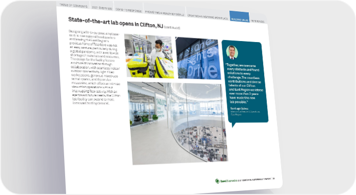 2021 CORPORATE RESPONSIBILITY REPORT I 59 State-of-the-art lab opens in Clifton, NJ (continued) Designing a fit-to-purpose, employee- centric new regional headquarters and leaving the East Region's previous home of Teterboro was not an easy venture, particularly during a global pandemic, with a worldwide shortage of materials and resources. The design for the facility fosters a culture of innovation through collaboration, with seamless indoor/ outdoor connectivity, light-filled workstations, generous mixed-use social spaces, and the oculus mezzanine, which offers an intimate view of lab operations without interrupting floor activity. With an eye toward future needs, the Clifton lab facility can expand to meet increased testing demand. “ Together, we overcame every obstacle and found solutions to every challenge. The countless contributions and diverse talents of our Clifton and East Region workforce over more than 2 years have made this new lab possible. ” Santiago Galvez Interim Vice President, Operations, East Region TABLE OF CONTENTS 2021 OVERVIEW COVID-19 RESPONSE PROMOTING A HEALTHIER WORLD CREATING AN INSPIRING WORKPLACE BUILDING VALUE REFERENCES