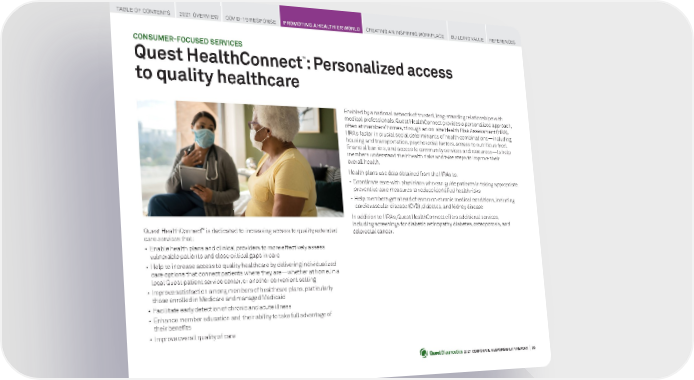 2021 CORPORATE RESPONSIBILITY REPORT I 36 CONSUMER-FOCUSED SERVICES Quest HealthConnect ™ : Personalized access to quality healthcare Quest HealthConnect ™ is dedicated to increasing access to quality extended care services that: • Enable health plans and clinical providers to more effectively assess vulnerable patients and close critical gaps in care • Help to increase access to quality healthcare by delivering individualized care options that connect patients where they are—whether at home, in a local Quest patient service center, or another convenient setting • Improve satisfaction among members of healthcare plans, particularly those enrolled in Medicare and managed Medicaid • Facilitate early detection of chronic and acute illness • Enhance member education and their ability to take full advantage of their benefits • Improve overall quality of care Enabled by a national network of trusted, long-standing relationships with medical professionals, Quest HealthConnect provides a personalized approach, often at members’ homes, through an on-site Health Risk Assessment (HRA). HRAs factor in crucial social determinants of health combinations—including housing and transportation, psychosocial factors, access to nutritious food, financial barriers, and access to community services and resources—to help members understand their health risks and take steps to improve their overall health. Health plans use data obtained from the HRAs to: • Coordinate care with physicians who can guide patients in taking appropriate preventive care measures to reduce identified health risks • Help members get ahead of common chronic medical conditions, including cardiovascular disease (CVD), diabetes, and kidney disease In addition to HRAs, Quest HealthConnect offers additional services, including screenings for diabetic retinopathy, diabetes, osteoporosis, and colorectal cancer. TABLE OF CONTENTS 2021 OVERVIEW COVID-19 RESPONSE PROMOTING A HEALTHIER WORLD CREATING AN INSPIRING WORKPLACE BUILDING VALUE REFERENCES