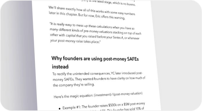 Raise Millions by Hustle Fund VC Page 25 We know a founder who raised a bunch of money via pre-money SAFEs. He didn’t realize his equity had been diluted so much until he tried to raise his equity round. This founder discovered he only owned 35% of the company at the seed stage, which is no bueno. We'll share exactly how all of this works with some easy numbers later in this chapter. But for now, Eric offers this warning, “It is really easy to mess up these calculations when you have so many different kinds of pre-money valuations stacking on top of each other with capital that you raised before your Series A, or whenever your post-money raise takes place.” Why founders are using post-money SAFEs instead To rectify the unintended consequences, YC later introduced post- money SAFEs. They wanted founders to have clarity on how much of the company they’re selling. Here’s the magic equation: (investment) / (post-money valuation) ● Example #1: The founder raises $500k on a $5M post-money valuation. $500k / $5M = 10%. This founder has sold 10% of the company. hustlefund.vc / @hustlefundvc
