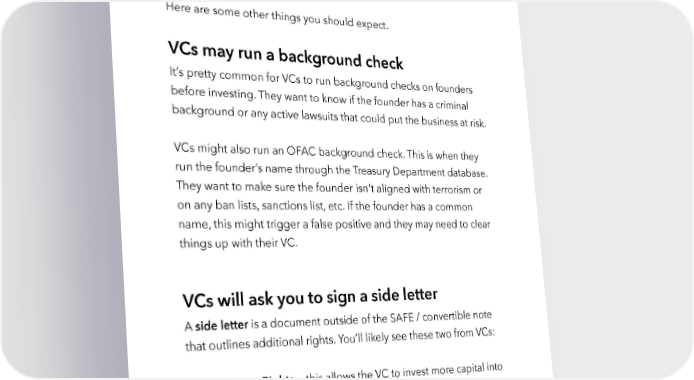 Raise Millions by Hustle Fund VC Page 121 And more documents. This can get more complex as you raise larger amounts of money. We recommend working with an attorney to make sure everything goes smoothly. Here are some other things you should expect. VCs may run a background check It’s pretty common for VCs to run background checks on founders before investing. They want to know if the founder has a criminal background or any active lawsuits that could put the business at risk. VCs might also run an OFAC background check. This is when they run the founder’s name through the Treasury Department database. They want to make sure the founder isn't aligned with terrorism or on any ban lists, sanctions list, etc. If the founder has a common name, this might trigger a false positive and they may need to clear things up with their VC. VCs will ask you to sign a side letter A side letter is a document outside of the SAFE / convertible note that outlines additional rights. You’ll likely see these two from VCs: 1. Pro Rata Rights — this allows the VC to invest more capital into your company in future fundraises typically on a “proportional” basis (the right to reinvest the amount required to maintain the equivalent percentage of equity as before). hustlefund.vc / @hustlefundvc