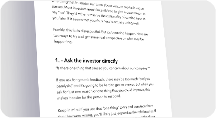 Raise Millions by Hustle Fund VC Page 111 How to ask for feedback if the investor says no One thing that frustrates our team about venture capital is vague passes. Most investors aren’t incentivized to give a clear reason to say “no”. They’d rather preserve the optionality of coming back to you later if it seems that your business is actually doing well. Frankly, this feels disrespectful. But it’s bound to happen. Here are two ways to try and get some real perspective on what may be happening. 1. – Ask the investor directly “Is there one thing that caused you concern about our company?” If you ask for generic feedback, there may be too much “analysis paralysis,” and it’s going to be hard to get an answer. But when you ask for just one reason or one thing that you could improve, this makes it easier for the person to respond. Keep in mind if you use that “one thing” to try and convince them that they were wrong, you’ll likely just jeopardize the relationship. If you do get feedback using this method, we recommend thanking them for their honesty, letting them know you’re addressing that piece, and asking if you can add them to your investor update newsletter. hustlefund.vc / @hustlefundvc