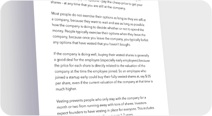 Raise Millions by Hustle Fund VC Page 35 Once a founder or an employee has vested some shares, that’s technically just a right to exercise the option to buy those shares for a cheap price (in most cases). Once your shares have vested, you can exercise or buy your options – pay the cheap price to get your shares – at any time that you are still at the company. Most people do not exercise their options as long as they are still at a company, because they want to wait and see as long as possible how the company is doing to decide whether or not to spend the money. People typically exercise their options when they leave the company, because once you leave the company, you typically forfeit any options that have vested that you haven’t bought. If the company is doing well, buying their vested shares is generally a good deal for the employee (especially early employees) because the price for each share is directly related to the valuation of the company at the time the employee joined. So an employee who joined a startup early could buy their fully-vested shares at, say $.05 per share, even if the current valuation of the company at that time is much higher. Vesting prevents people who only stay with the company for a month or two from running away with tons of shares. Investors expect founders to have vesting in place for everyone. This includes advisors, whose shares typically vest over 1-2 years. You might be wondering, “What if everyone stays on until their vesting schedule is complete and exercises all their options?” Then hustlefund.vc / @hustlefundvc