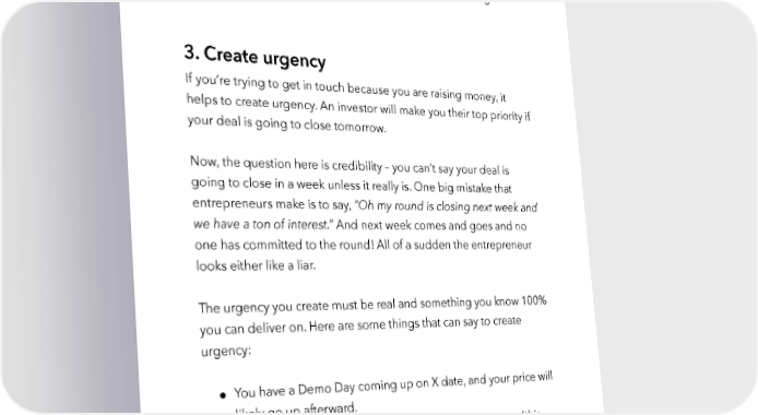 Raise Millions by Hustle Fund VC Page 114 They control the investor’s calendar, and while the investor may not 100% follow that calendar, the assistant may be able to nudge the investor or slot you in for another meeting if you’re still having trouble. 3. Create urgency If you’re trying to get in touch because you are raising money, it helps to create urgency. An investor will make you their top priority if your deal is going to close tomorrow. Now, the question here is credibility – you can’t say your deal is going to close in a week unless it really is. One big mistake that entrepreneurs make is to say, “Oh my round is closing next week and we have a ton of interest.” And next week comes and goes and no one has committed to the round! All of a sudden the entrepreneur looks either like a liar. The urgency you create must be real and something you know 100% you can deliver on. Here are some things that can say to create urgency: ● You have a Demo Day coming up on X date, and your price will likely go up afterward. ● You are in second-meetings with a number of investors (this must be true!) and you expect the round to close soon. hustlefund.vc / @hustlefundvc