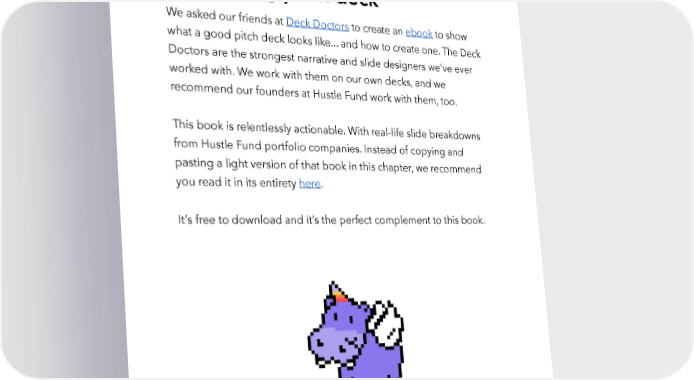Raise Millions by Hustle Fund VC Page 62 How to actually design a captivating pitch deck We asked our friends at Deck Doctors to create an ebook to show what a good pitch deck looks like... and how to create one. The Deck Doctors are the strongest narrative and slide designers we've ever worked with. We work with them on our own decks, and we recommend our founders at Hustle Fund work with them, too. This book is relentlessly actionable. With real-life slide breakdowns from Hustle Fund portfolio companies. Instead of copying and pasting a light version of that book in this chapter, we recommend you read it in its entirety here. It’s free to download and it’s the perfect complement to this book. “You’re halfway done!” hustlefund.vc / @hustlefundvc