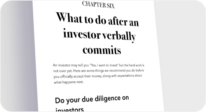 Raise Millions by Hustle Fund VC Page 116 CHAPTER SIX What to do after an investor verbally commits An investor may tell you “Yes, I want to invest” but the hard work is not over yet. Here are some things we recommend you do before you officially accept their money, along with expectations about what happens next. Do your due diligence on investors It’s normal for early-stage startups to grow for 7-10 years before getting acquired or creating an IPO. This means that founders will interact with their investors for a long time. As Eric puts it, you’re hustlefund.vc / @hustlefundvc