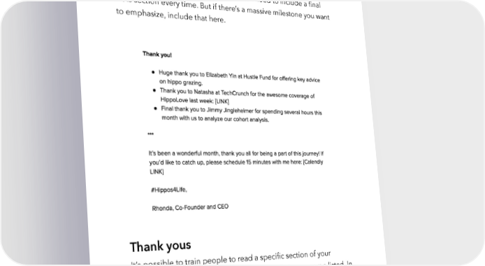 Raise Millions by Hustle Fund VC Page 108 Final stats It can be helpful to reiterate some important metrics again toward the end of the newsletter. Founders don't need to include a final stats section every time. But if there’s a massive milestone you want to emphasize, include that here. Thank yous It’s possible to train people to read a specific section of your newsletter by giving them a chance to see their own name listed. In our Hustle Fund investor newsletter, we give a dozen shout-outs to hustlefund.vc / @hustlefundvc