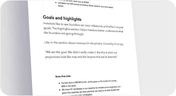 Raise Millions by Hustle Fund VC Page 107 Goals and highlights Investors like to see founders set clear milestones and reflect on past goals. The highlights section helps investors better understand what the founders are going through. Like in the section about revenue (in the photo), it’s totally ok to say, “We set this goal. We didn’t really make it. But this is what our projections look like now and the lessons that we’ve learned.” hustlefund.vc / @hustlefundvc