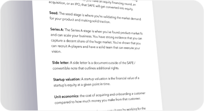 Raise Millions by Hustle Fund VC Page 147 SAFEs: SAFE stands for “simple agreement for future equity.” A SAFE isn’t equity you sell to your investors, rather it’s the promise of equity in the future. Think of SAFEs almost like an IOU – you’re not issuing any equity yet… but once you have an equity financing round, an acquisition, or an IPO, that SAFE will get converted into equity. Seed: The seed stage is where you're validating the market demand for your product and making solid traction. Series A: The Series A stage is when you’ve found product-market fit and can scale your business. You have strong evidence that you can capture a decent share of the huge market. You’ve shown that you can recruit A-players and have a solid team that can execute your vision. Side letter: A side letter is a document outside of the SAFE / convertible note that outlines additional rights. Startup valuation: A startup valuation is the financial value of a startup’s equity at a given point in time. Unit economics: the cost of acquiring and onboarding a customer compared to how much money you make from that customer. Vesting: Founders and employees earn shares by working for the startup, but their shares vest across 4 years. This means they don’t get all the shares upfront when they start/join the company. They have to work at the company for 4 years to get all of them. Vesting hustlefund.vc / @hustlefundvc