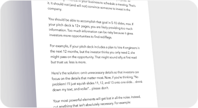 Raise Millions by Hustle Fund VC Page 60 Keep your pitch deck short For an early-stage company, the pitch deck has one purpose: to drive enough interest in your business to schedule a meeting. That’s it. It should not (and will not) convince someone to invest in the company. You should be able to accomplish that goal in 5-10 slides, max. If your pitch deck is 12+ pages, you are likely providing too much information. Too much information can be risky because it gives investors more opportunities to find red flags. For example, if your pitch deck includes a plan to hire 4 engineers in the next 12 months, but the investor thinks you only need 2, she might pass on the opportunity. That might sound silly at first read but trust us: less is more. Here's the solution: omit unnecessary details so that investors can focus on the details that matter most. Now, if you’re thinking, “No problem! I’ll just squish slides 11, 12, and 13 onto one slide… shrink down my text, and voila!”... please don’t. Your most powerful elements will get lost in all the noise. Instead, cut anything that isn’t absolutely necessary. For example: ● That slide about how many people you’re going to hire → Focus instead on the amazing team you already have (even if it’s just you) hustlefund.vc / @hustlefundvc