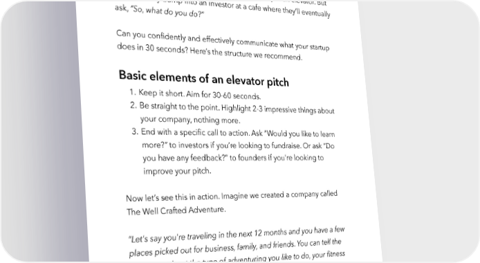 Raise Millions by Hustle Fund VC Page 74 Create your elevator pitch OK it’s unlikely you’ll actually pitch your company in an elevator. But you will likely bump into an investor at a cafe where they’ll eventually ask, “So, what do you do?” Can you confidently and effectively communicate what your startup does in 30 seconds? Here’s the structure we recommend. Basic elements of an elevator pitch 1. Keep it short. Aim for 30-60 seconds. 2. Be straight to the point. Highlight 2-3 impressive things about your company, nothing more. 3. End with a specific call to action. Ask “Would you like to learn more?” to investors if you’re looking to fundraise. Or ask “Do you have any feedback?” to founders if you’re looking to improve your pitch. Now let’s see this in action. Imagine we created a company called The Well Crafted Adventure. “Let's say you're traveling in the next 12 months and you have a few places picked out for business, family, and friends. You can tell the app more about the type of adventuring you like to do, your fitness level, where you plan to travel, etc. And this app will spit out recommended adventures in each location. It will connect you with a local expert and it'll provide a list of places where you can rent gear hustlefund.vc / @hustlefundvc