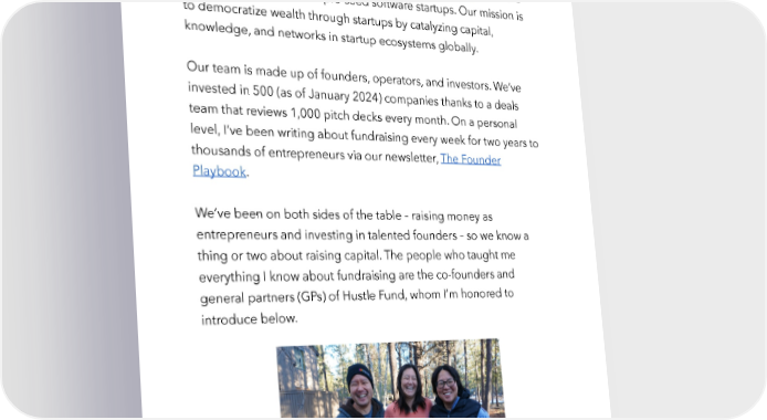 Raise Millions by Hustle Fund VC Page 5 Who is Hustle Fund? My name is Tam and I’m one of the writers at Hustle Fund, a venture capital firm that invests in pre-seed software startups. Our mission is to democratize wealth through startups by catalyzing capital, knowledge, and networks in startup ecosystems globally. Our team is made up of founders, operators, and investors. We’ve invested in 500 (as of January 2024) companies thanks to a deals team that reviews 1,000 pitch decks every month. On a personal level, I’ve been writing about fundraising every week for two years to thousands of entrepreneurs via our newsletter, The Founder Playbook. We’ve been on both sides of the table – raising money as entrepreneurs and investing in talented founders – so we know a thing or two about raising capital. The people who taught me everything I know about fundraising are the co-founders and general partners (GPs) of Hustle Fund, whom I’m honored to introduce below. hustlefund.vc / @hustlefundvc