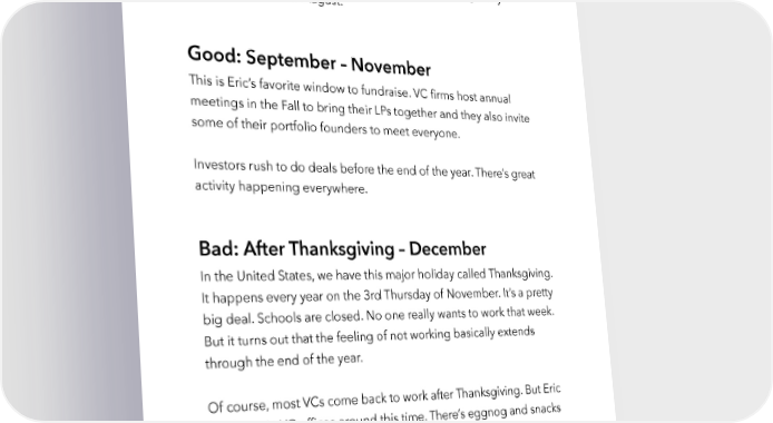Raise Millions by Hustle Fund VC Page 43 There’s also Burning Man at the end of August. This is when VCs go off to the desert wearing ridiculous costumes and return after a week covered in dust. So you’re probably not going to get any meetings with VCs in August. Good: September – November This is Eric’s favorite window to fundraise. VC firms host annual meetings in the Fall to bring their LPs together and they also invite some of their portfolio founders to meet everyone. Investors rush to do deals before the end of the year. There’s great activity happening everywhere. Bad: After Thanksgiving – December In the United States, we have this major holiday called Thanksgiving. It happens every year on the 3rd Thursday of November. It’s a pretty big deal. Schools are closed. No one really wants to work that week. But it turns out that the feeling of not working basically extends through the end of the year. Of course, most VCs come back to work after Thanksgiving. But Eric has been in VC offices around this time. There’s eggnog and snacks everywhere. Michael Buble's music is playing in the background. The energy is super low key. hustlefund.vc / @hustlefundvc