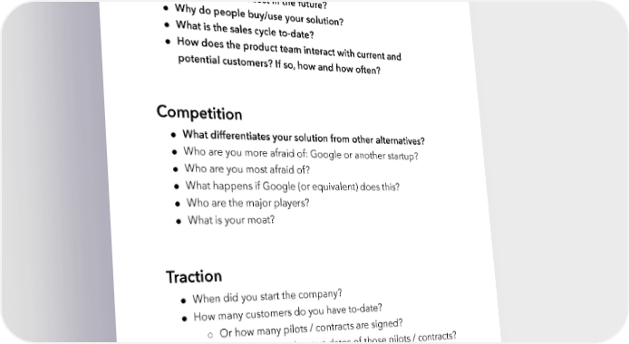 Raise Millions by Hustle Fund VC Page 83 over time? And which channels are working or not working? ● How much does your solution/product cost (COGs)? ● How much will it cost in the future? ● Why do people buy/use your solution? ● What is the sales cycle to-date? ● How does the product team interact with current and potential customers? If so, how and how often? Competition ● What differentiates your solution from other alternatives? ● Who are you more afraid of: Google or another startup? ● Who are you most afraid of? ● What happens if Google (or equivalent) does this? ● Who are the major players? ● What is your moat? Traction ● When did you start the company? ● How many customers do you have to-date? ○ Or how many pilots / contracts are signed? ■ When are the start dates of those pilots / contracts? ■ What are the contingencies? ○ Or how many LOIs signed? What do those look like? ● How much revenue have you generated to date? hustlefund.vc / @hustlefundvc