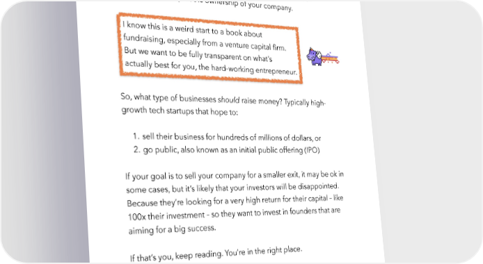 Raise Millions by Hustle Fund VC Page 9 So if you can get away with securing money through bootstrapping, crowdfunding, government programs, banks, or even alternative lending models like Paintbrush… we actually recommend not fundraising to keep 100% ownership of your company. I know this is a weird start to a book about fundraising, especially from a venture capital firm. But we want to be fully transparent on what’s actually best for you, the hard-working entrepreneur. So, what type of businesses should raise money? Typically high- growth tech startups that hope to: 1. sell their business for hundreds of millions of dollars, or 2. go public, also known as an initial public offering (IPO) If your goal is to sell your company for a smaller exit, it may be ok in some cases, but it’s likely that your investors will be disappointed. Because they’re looking for a very high return for their capital – like 100x their investment – so they want to invest in founders that are aiming for a big success. If that’s you, keep reading. You’re in the right place. hustlefund.vc / @hustlefundvc