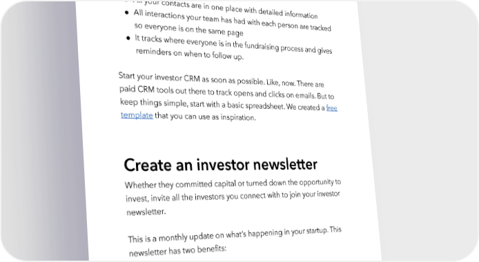 Raise Millions by Hustle Fund VC Page 103 What’s the key takeaway? Your investor CRM is a critical tool for successful fundraising. ● All your contacts are in one place with detailed information ● All interactions your team has had with each person are tracked so everyone is on the same page ● It tracks where everyone is in the fundraising process and gives reminders on when to follow up. Start your investor CRM as soon as possible. Like, now. There are paid CRM tools out there to track opens and clicks on emails. But to keep things simple, start with a basic spreadsheet. We created a free template that you can use as inspiration. Create an investor newsletter Whether they committed capital or turned down the opportunity to invest, invite all the investors you connect with to join your investor newsletter. This is a monthly update on what’s happening in your startup. This newsletter has two benefits: 1. It keeps your existing investors engaged – and helps you make important asks when you need support. hustlefund.vc / @hustlefundvc