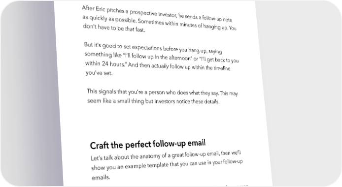 Raise Millions by Hustle Fund VC Page 91 Follow up immediately after the call After Eric pitches a prospective investor, he sends a follow-up note as quickly as possible. Sometimes within minutes of hanging up. You don’t have to be that fast. But it’s good to set expectations before you hang up, saying something like “I’ll follow up in the afternoon” or “I’ll get back to you within 24 hours.” And then actually follow up within the timeline you’ve set. This signals that you’re a person who does what they say. This may seem like a small thing but investors notice these details. Craft the perfect follow-up email Let’s talk about the anatomy of a great follow-up email, then we’ll show you an example template that you can use in your follow-up emails. First, we recommend reiterating details that made the other person excited during the call. Here’s an example. hustlefund.vc / @hustlefundvc
