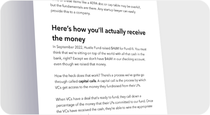 Raise Millions by Hustle Fund VC Page 127 ● Capitalization Table (if any) ● Proprietary Information and Investments Assignment Agreements (PIIAs) Some of these items like a 409A doc or cap table may be overkill, but the fundamentals are there. Any startup lawyer can easily provide this to a company. Here’s how you’ll actually receive the money In September 2022, Hustle Fund raised $46M for Fund III. You must think that we’re sitting on top of the world with all that cash in the bank, right? Except we don’t have $46M in our checking account, even though we raised that money. How the heck does that work? There’s a process we’ve gotta go through called capital calls. A capital call is the process by which VCs get access to the money they fundraised from their LPs. When VCs have a deal that’s ready to fund, they call down a percentage of the money that their LPs committed to our fund. Once the VCs have received the cash, they’re able to wire the appropriate amount to the founders. The norm in VC is to ask for little portions of their funds several times each year. But if they haven’t called enough to fund all the startups hustlefund.vc / @hustlefundvc