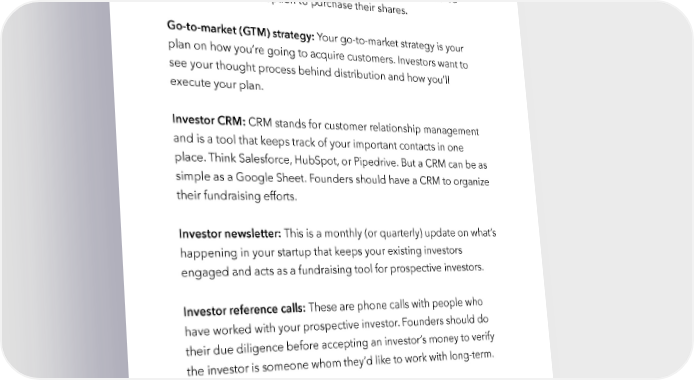 Raise Millions by Hustle Fund VC Page 145 Fully diluted cap table: If the founders, investors, and key employees stay on until their vesting schedule is complete, then you’ll have a fully diluted cap table. Everyone who was allocated shares will have the option to purchase their shares. Go-to-market (GTM) strategy: Your go-to-market strategy is your plan on how you’re going to acquire customers. Investors want to see your thought process behind distribution and how you’ll execute your plan. Investor CRM: CRM stands for customer relationship management and is a tool that keeps track of your important contacts in one place. Think Salesforce, HubSpot, or Pipedrive. But a CRM can be as simple as a Google Sheet. Founders should have a CRM to organize their fundraising efforts. Investor newsletter: This is a monthly (or quarterly) update on what’s happening in your startup that keeps your existing investors engaged and acts as a fundraising tool for prospective investors. Investor reference calls: These are phone calls with people who have worked with your prospective investor. Founders should do their due diligence before accepting an investor’s money to verify the investor is someone whom they’d like to work with long-term. Lead investor: A lead investor is the main investor in a funding round. They usually put half or more of the money into the round. hustlefund.vc / @hustlefundvc