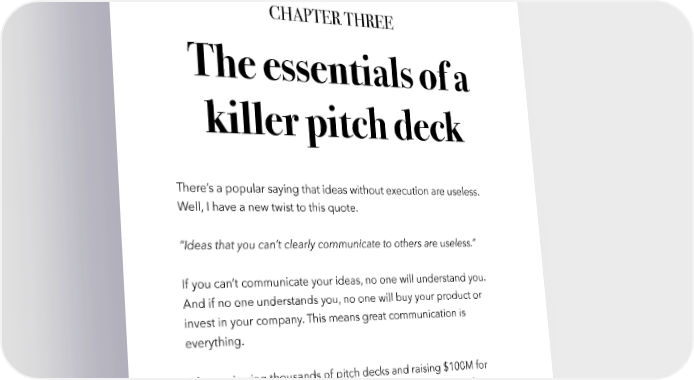 Raise Millions by Hustle Fund VC Page 45 CHAPTER THREE The essentials of a killer pitch deck There’s a popular saying that ideas without execution are useless. Well, I have a new twist to this quote. “Ideas that you can’t clearly communicate to others are useless.” If you can’t communicate your ideas, no one will understand you. And if no one understands you, no one will buy your product or invest in your company. This means great communication is everything. After reviewing thousands of pitch decks and raising $100M for Hustle Fund, Eric has deduced the five most essential parts for a great pitch. hustlefund.vc / @hustlefundvc